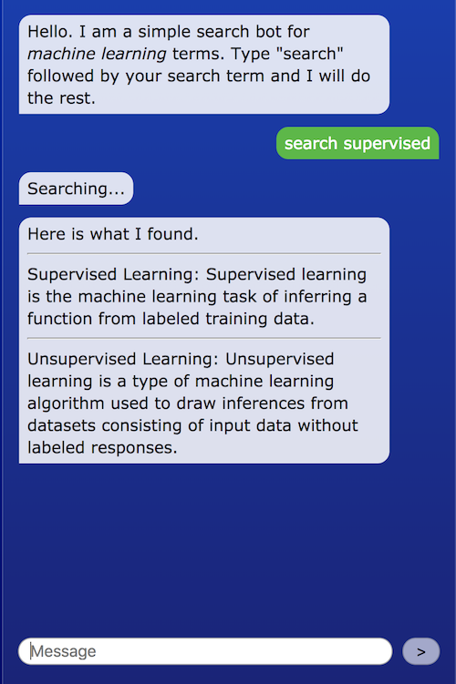 Create a trigger in your chatbot script like the one below that will respond to the user typing "search" followed by a word. The response will begin with "Searching..." to provide feedback to the user, then call a searchTerms() function that we will define next.