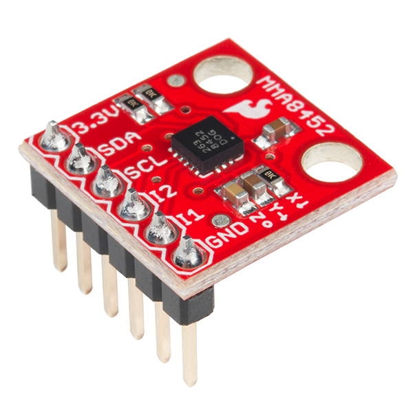 The MMA8452Q triple-axis accelerometer in your Photon kit has 6 pins located along its front edge (which determines its orientation for measuring pitch and roll). There are labels for each pin printed on the accelerometer circuit board. However, only 4 of the pins will need to be connected to your Photon.