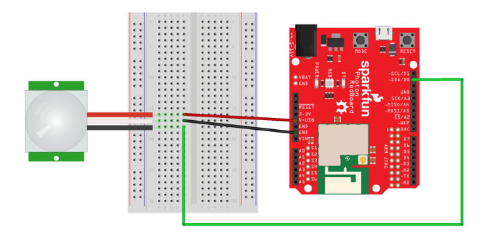 Here are the steps to connect the motion sensor to your Photon using the breadboard:
