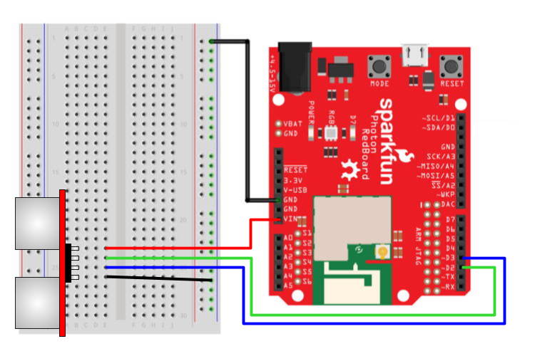 Plug one end of a jumper wire into the same terminal strip row as the sensor's VCC pin. Plug the other end of this jumper wire into either the VIN pin or V-USB pin on the Photon circuit board (or to a positive power rail on the breadboard that is connected to VIN or V-USB). If your Photon is being powered through the barrel jack, connect to the VIN pin. Otherwise, if your Photon is being powered through the Micro-USB port, connect to the V-USB pin.