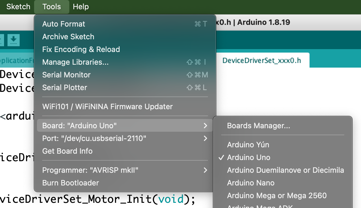 Notice the board is `Arduino Uno` and the port is `usb` of some variety.