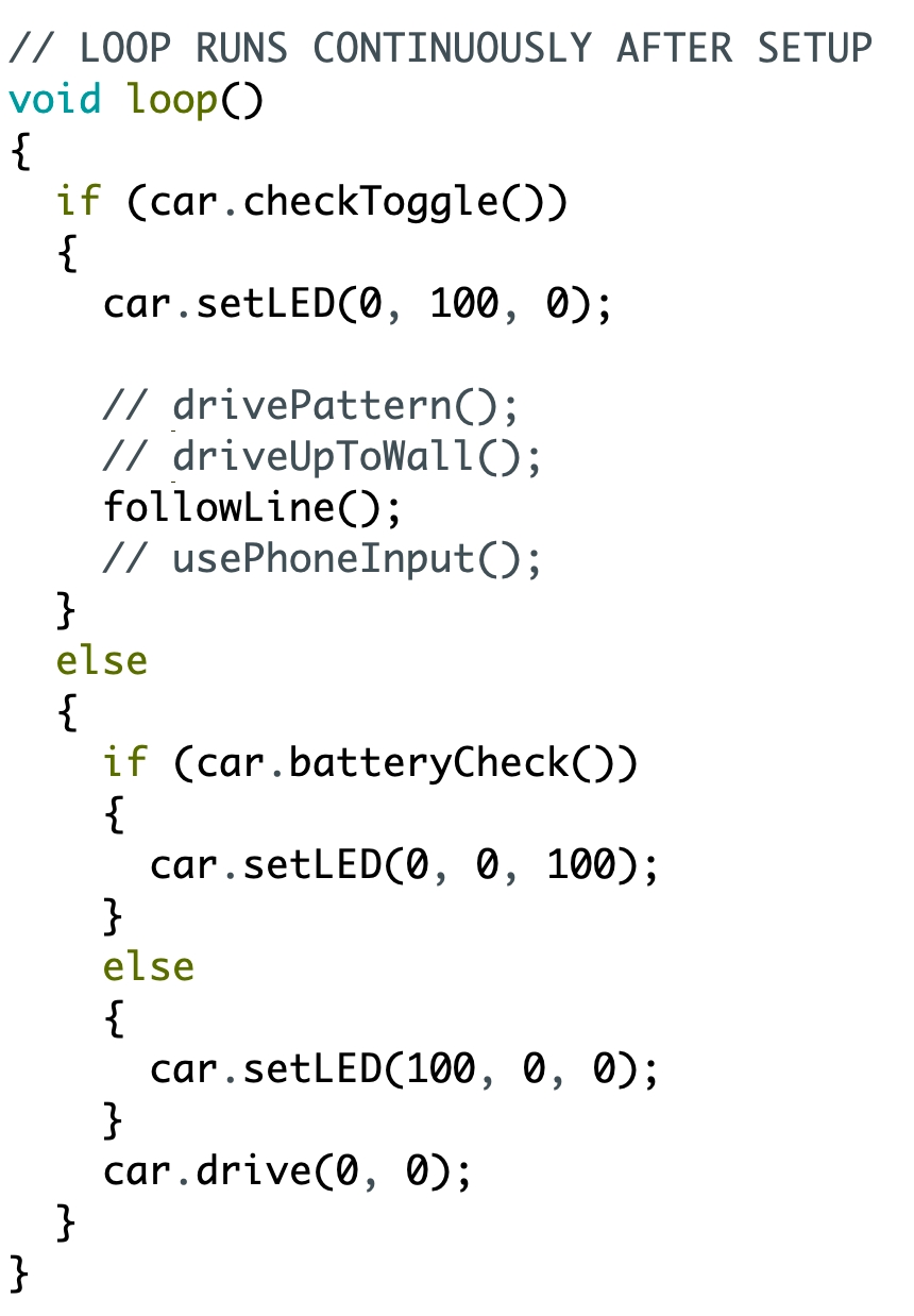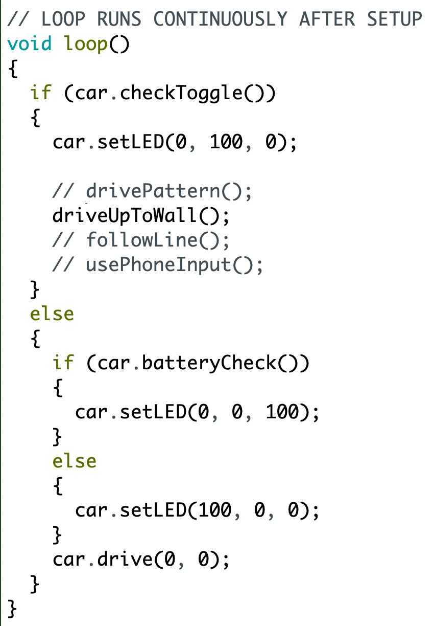 Uncomment the driveUpToWall() function call in the loop, as show below. Comment out the drivePattern() function like  //drivePattern(); Since we don't want to run both functions. Upload the edited program to see what happens after you flip the toggle switch on the robot.