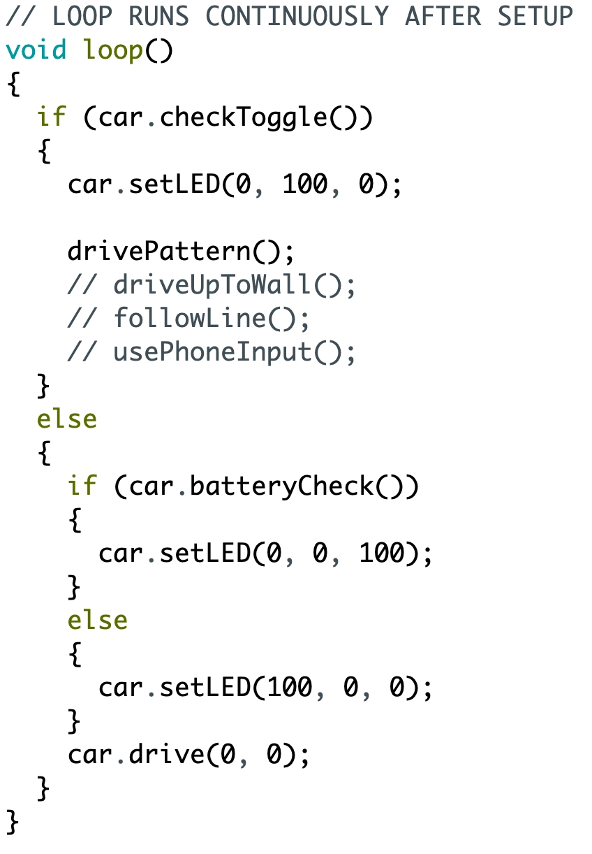 Uncomment the drivePattern() function call in the loop, as show below. Remember, // identifies comments that are not run by the program. So when we remove the // that line will now run. Upload the edited program to see what happens after you flip the toggle switch on the robot.