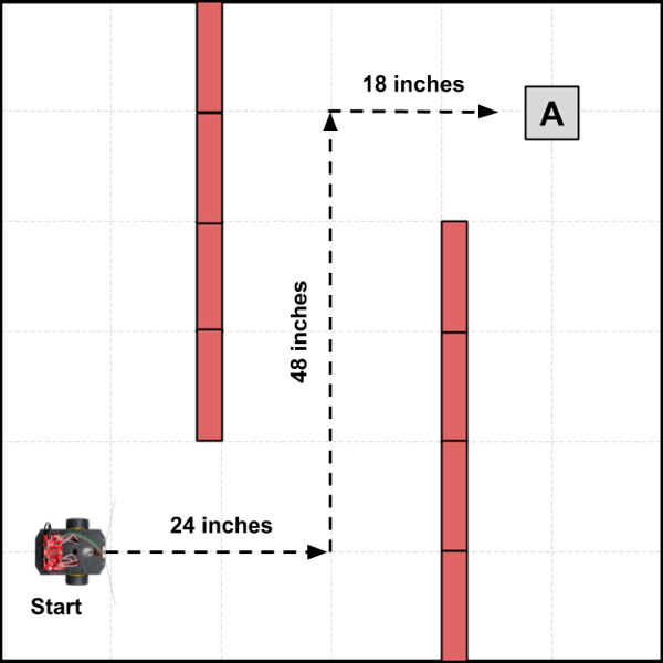 When using distance navigation, the robot drives straight for a specific distance, and then turns to start driving in a new direction. The robot's path is programmed as an ordered sequence of specific distances and turns.