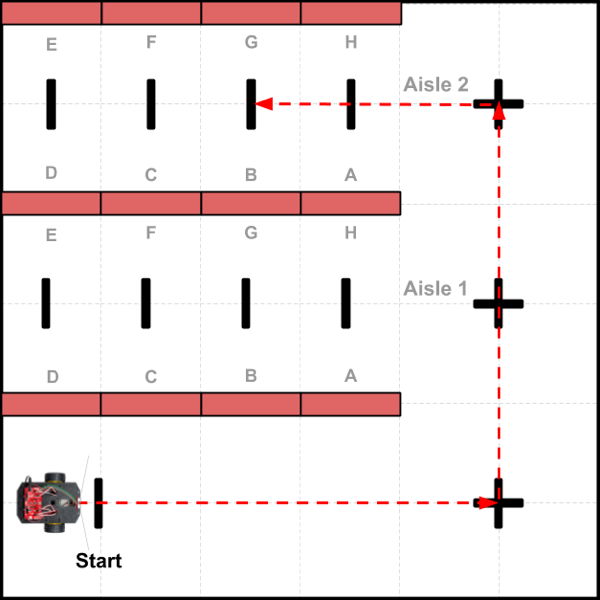 In this task scenario, a store robot will navigate through the store aisles (red rectangles are cardboard boxes representing store shelves) to a specific location (Shelf B in Aisle 2), deliver a box of items to be stocked (simulated step), and then drive back to the stockroom (labeled as "Start"). The black lines and "plus signs" are line markers that the robot will use for navigation.
