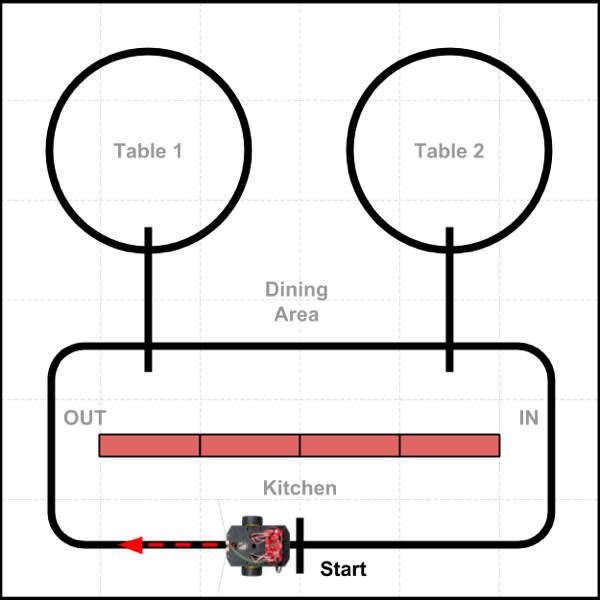 In this task scenario, a restaurant robot will deliver a food order from the kitchen to Table 2 (red rectangles are cardboard boxes representing a wall), drive around the table (delivering each person's order), and then return to the "Start" line marker in the kitchen.