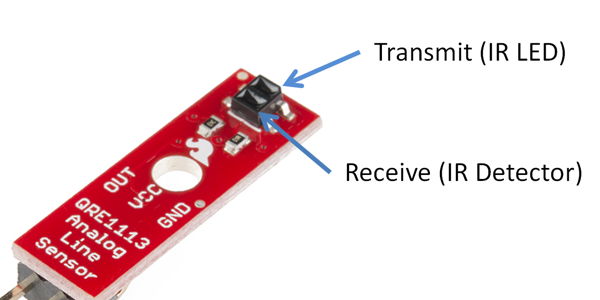 The bottom of each sensor has an LED that transmits infrared (IR) light, which is invisible to the human eye. The bottom of each sensor also has an IR detector, which measures how much of the IR light is reflected back by the surface that the robot is driving on.