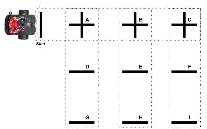 If necessary, you can also place line markers in a "grid-like" pattern, in order to allow your robot to travel between different locations. For example, this diagram shows a series of line markers with a starting location plus a set of locations labeled with letters A-I:
