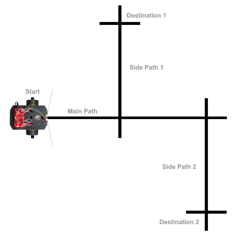 A custom function named followCountLine() uses IR line sensors to make the robot follow a line while also counting line markers the robot crosses. The robot will stop driving when it reaches a specific line number. You can then make the robot turn and start following a new line.
