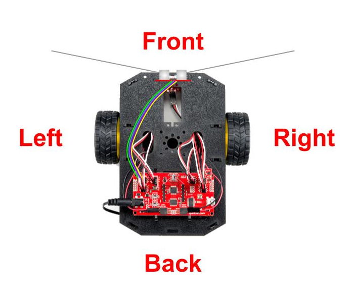 A simple (but important) step is to understand the orientation of the RedBot — specifically, which end is the front of the robot? An easy way to remember: most of the sensors are attached at the front end, while the circuit board is located at the back end.