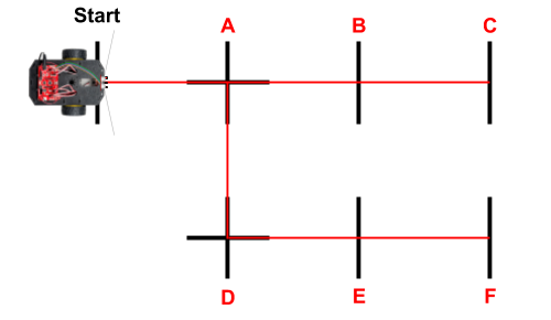 The diagram below has red lines to show you the possible paths that the robot can take using this new line marker pattern. Each of the line markers has been labeled with a letter (A-F). (Do not add the red lines to your line marker pattern.) As you can see, the robot's possible path has multiple branches. Each line marker represents a possible stopping point or turning point along a specific path.