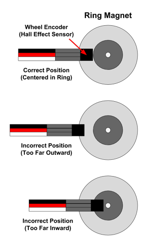 In order to function accurately, each wheel encoder sensor must be positioned correctly, relative to its ring magnet. The sensor tip must be centered within the silver band of the ring magnet (not too far inward or outward) and must be close to the ring magnet's surface (about ⅛" inch away).