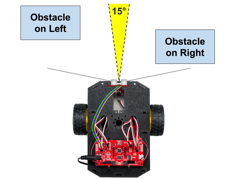 However, the ultrasonic sensor might not detect obstacles off to the left side or right side — if those obstacles are outside the 15° detection cone directly in front of the sensor. For these situations, you may want to use the mechanical bumpers as a fallback system to supplement the ultrasonic sensor. Since the mechanical bumper whiskers extend outwards on both sides, they can detect a collision with an obstacle that the ultrasonic sensor might not detect (as shown below).