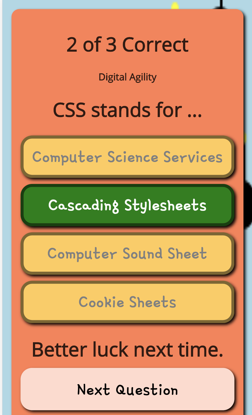 Next you will need to update the score presented on the screen at the appropriate time. For starters, place the following line of Javascript inside the curly braces { } of the onClickedAnswer() function code block. Placing it at the top of the code block is a good place.