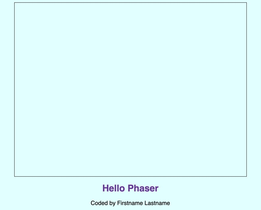 Your webpage should have a light blue background, and you should see a black border outlining where the game canvas will eventually be inserted (once you add the proper JS code to the script.js file). Below that you should see the game's title (in purple text) and your name. Everything should be centered horizontally.