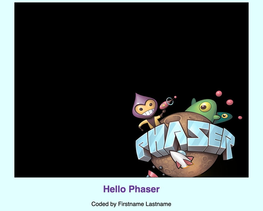 To do this, you'll start using Phaser CE code in your JS file. Remember that your HTML loaded the Phaser CE game framework (phaser.min.js), which defines classes for objects you can use in your game code. Each Phaser game object has a set of properties (variables) and methods (functions) that you can use to modify the object.