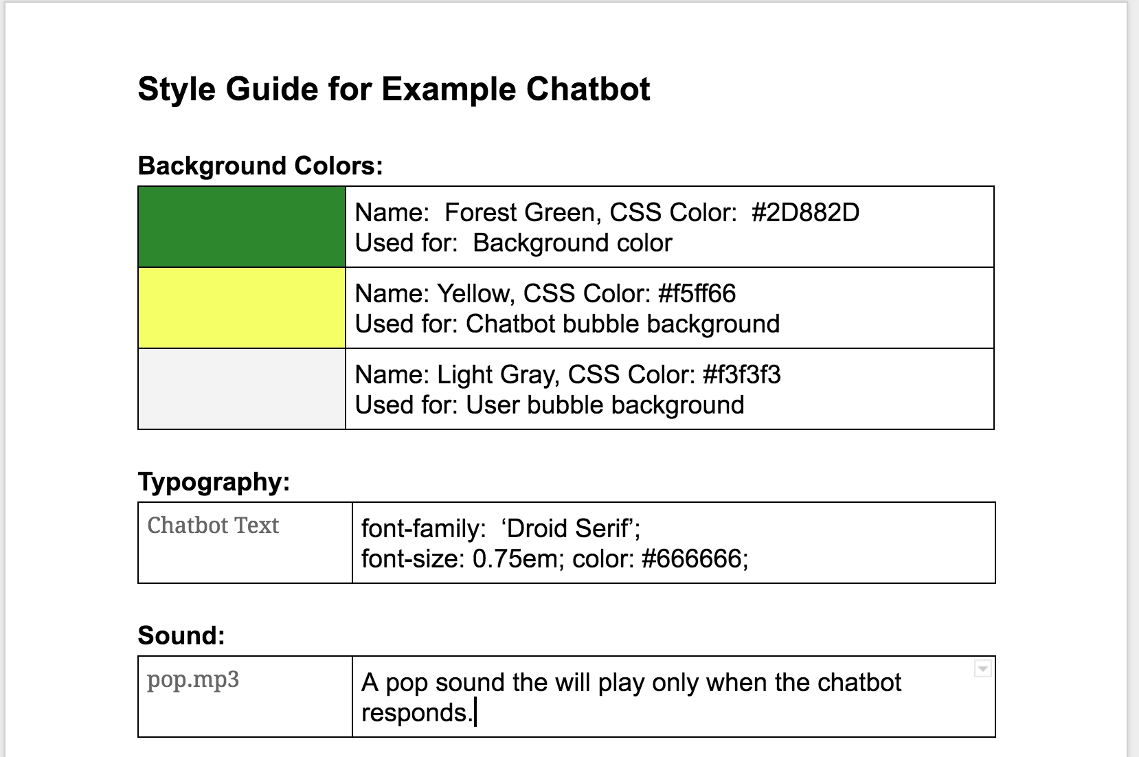 Create a simple document that outlines the style elements of your chatbot. You will want to determine the following elements, at a minimum, and document a description and visual samples of each when possible.