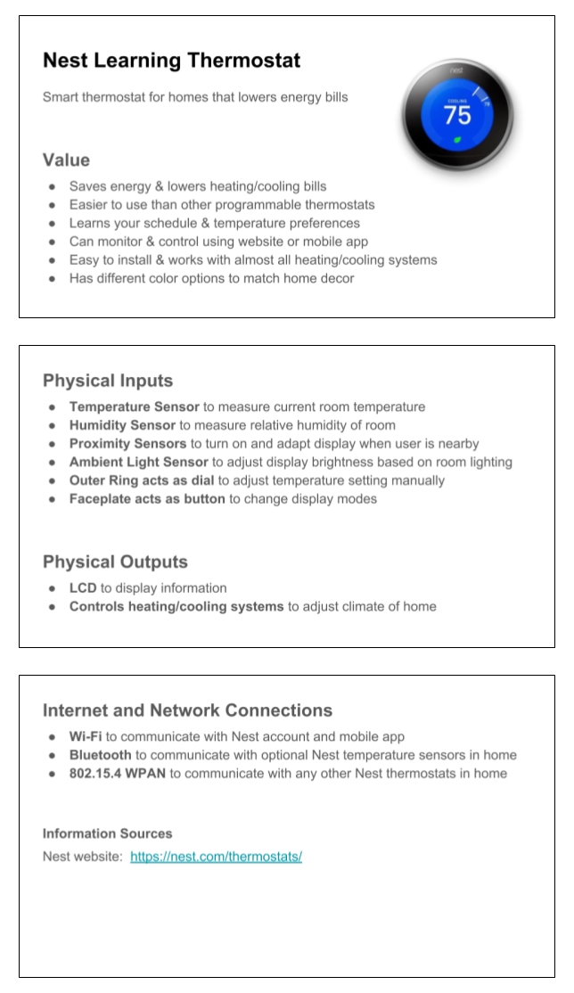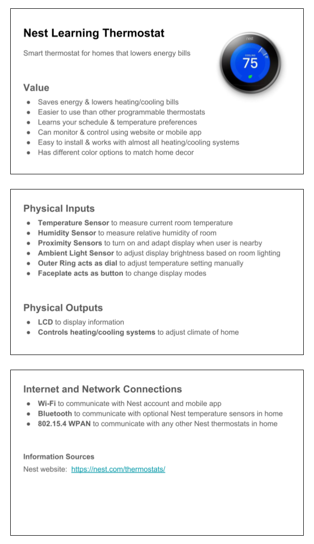 Presentation provides clear, concise, and complete information about example IoT products in consumer, business, and public contexts.