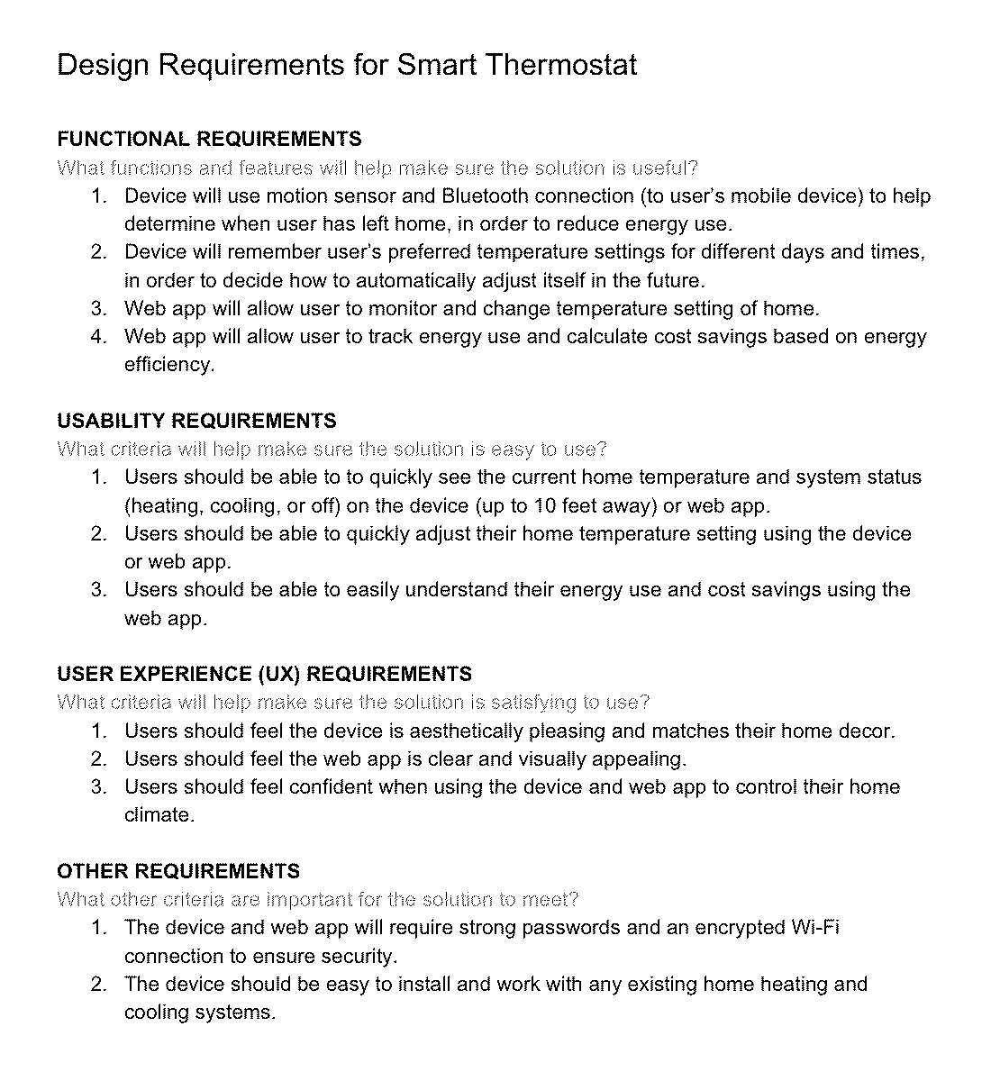 Design requirements are clear, complete, and measurable. Requirements are informed by team's previous research and ideation. Requirements provide useful guidance for designing effective solution.