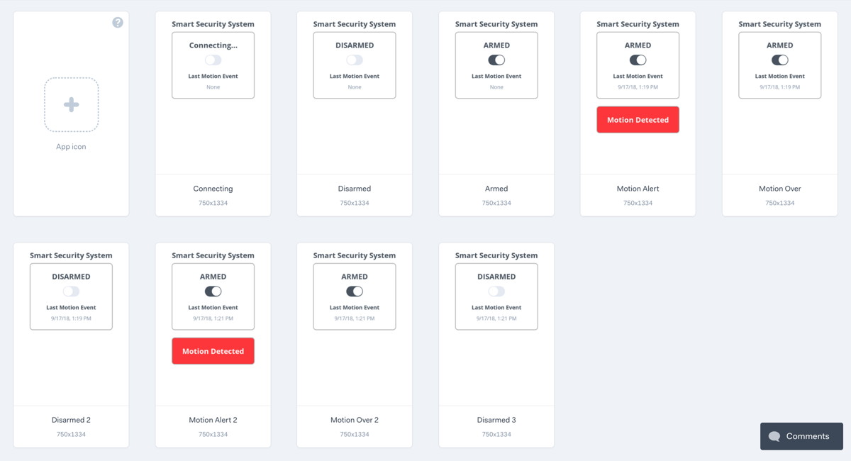 Click on the interactive prototype shown below to start interacting with it. Once you "arm" the security system, it will simulate a "motion" event after 5 seconds. A second simulated motion event will occur after several more seconds.