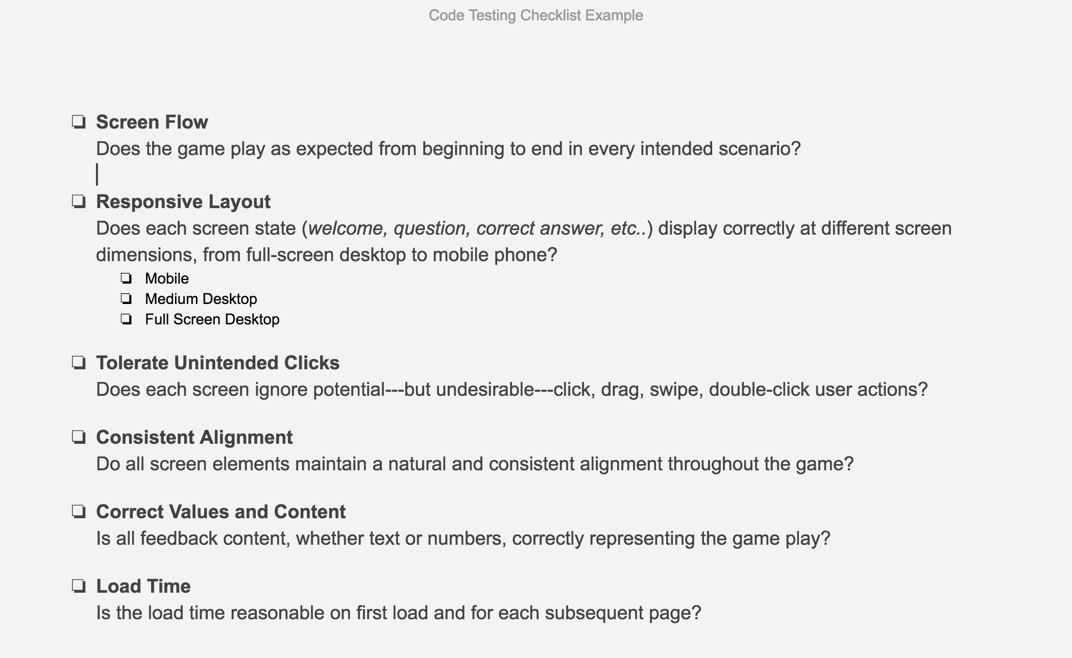 Conduct some basic code testing to verify that the app is acting as expected under different conditions. Ensure that everything works as expected on different size screens and with touch or mouse interactions. Consider all the things a user might do, like double click, click and drag, swipe, change browser dimensions mid-game, etc.