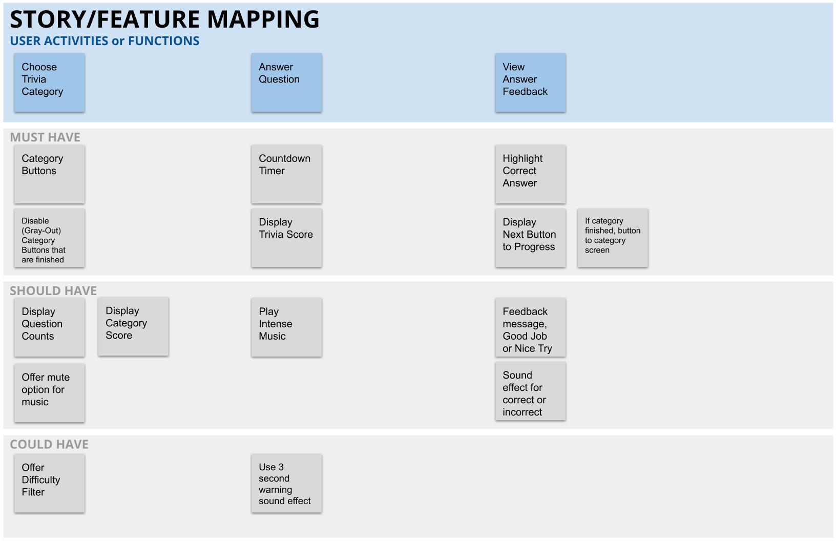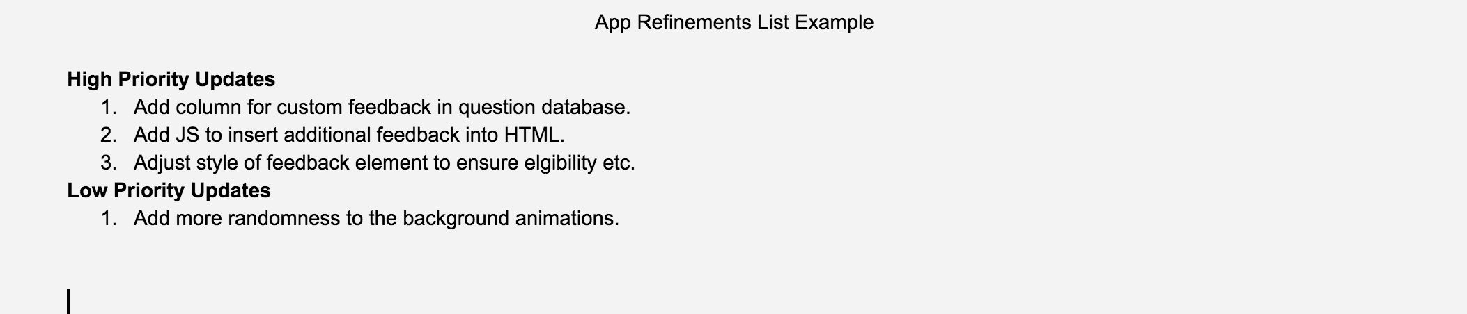 It is important to determine how you can get the most return (improvements in the trivia game) from the time you have remaining to work. So, based on your evaluation findings and question analysis, determine a plan to implement improvements while frequently testing to ensure nothing is unintentionally broken. Similar to your code requirements document earlier, simply list items by priority--high priority changes and low priority changes.