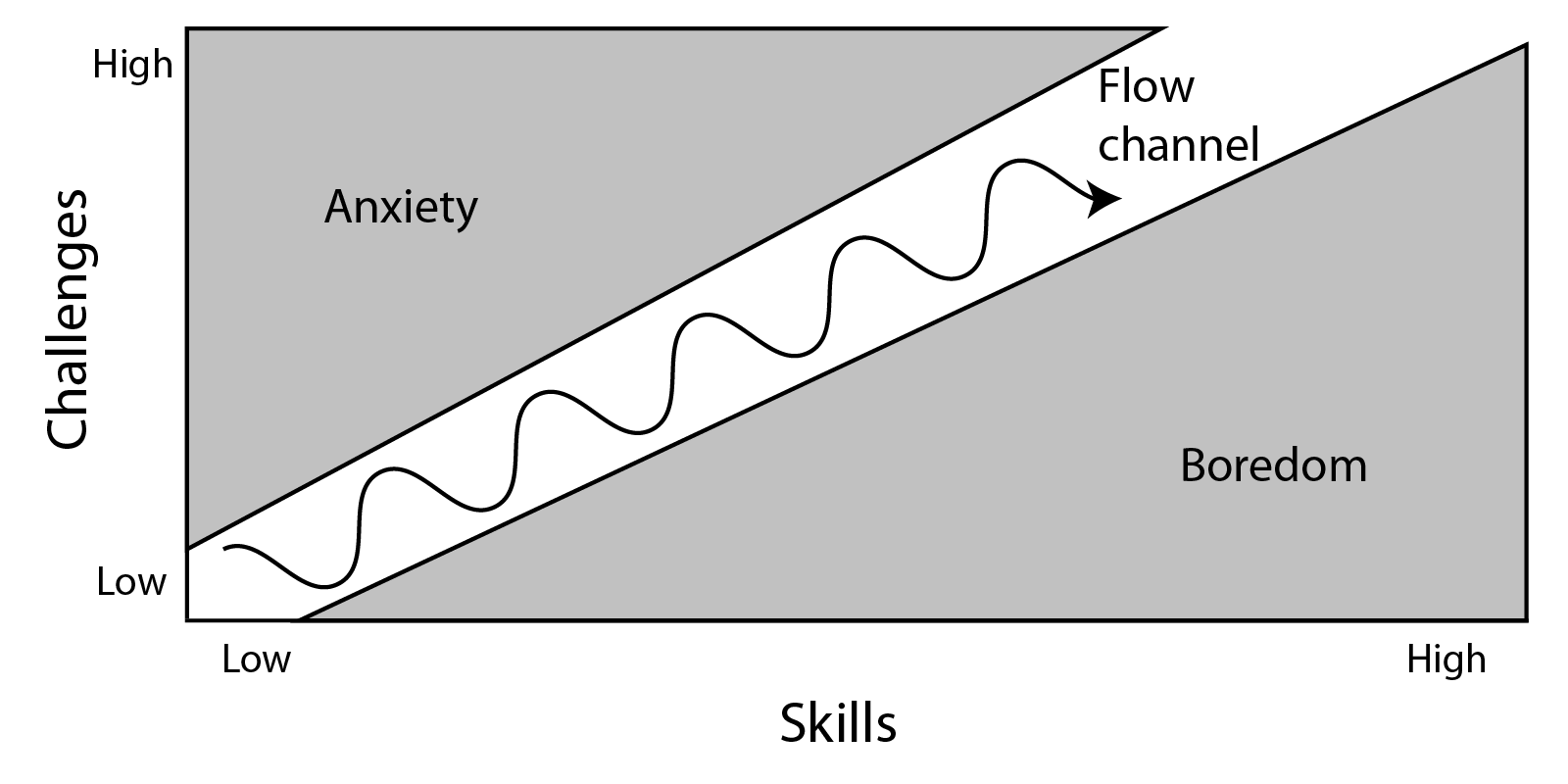 As you continue to perform a task, your skills tend to increase over time, so the challenges also need to increase at an appropriate rate to keep you in flow (and prevent you from becoming anxious or bored).