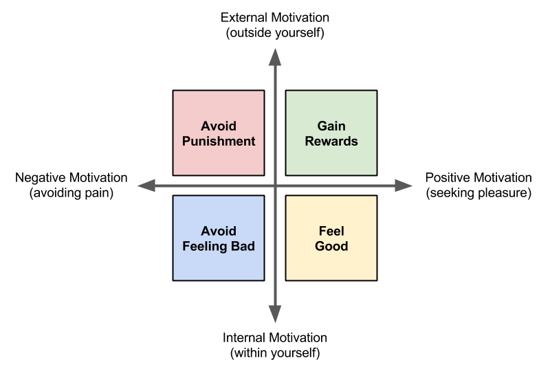 External vs. Internal — External motivations originate outside ourselves, while internal motivations come from within ourselves.