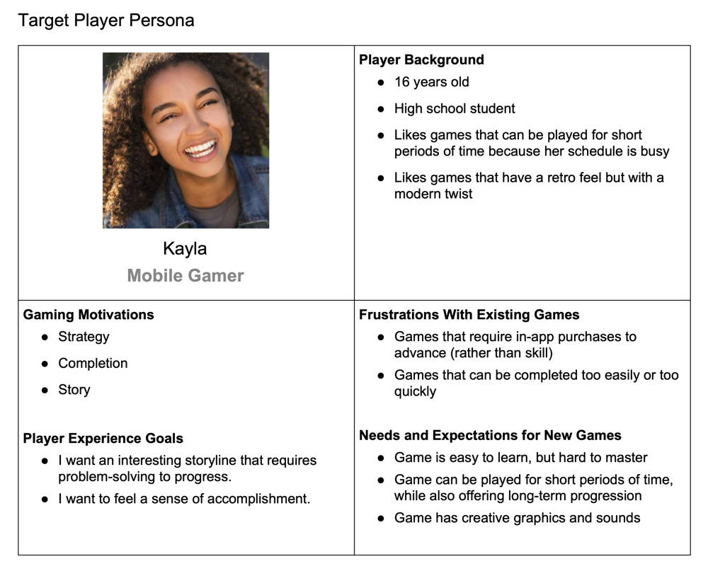 Finally, your team will use its targeted gaming motivations and player experience goals to create a persona representing a possible target player for your game.