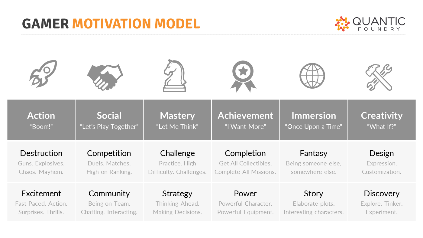 You'll use Quantic Foundry's Gamer Motivation Model, which identifies 12 different gaming motivations that form into 6 motivation groups (Action, Social, Mastery, Achievement, Immersion, and Creativity).